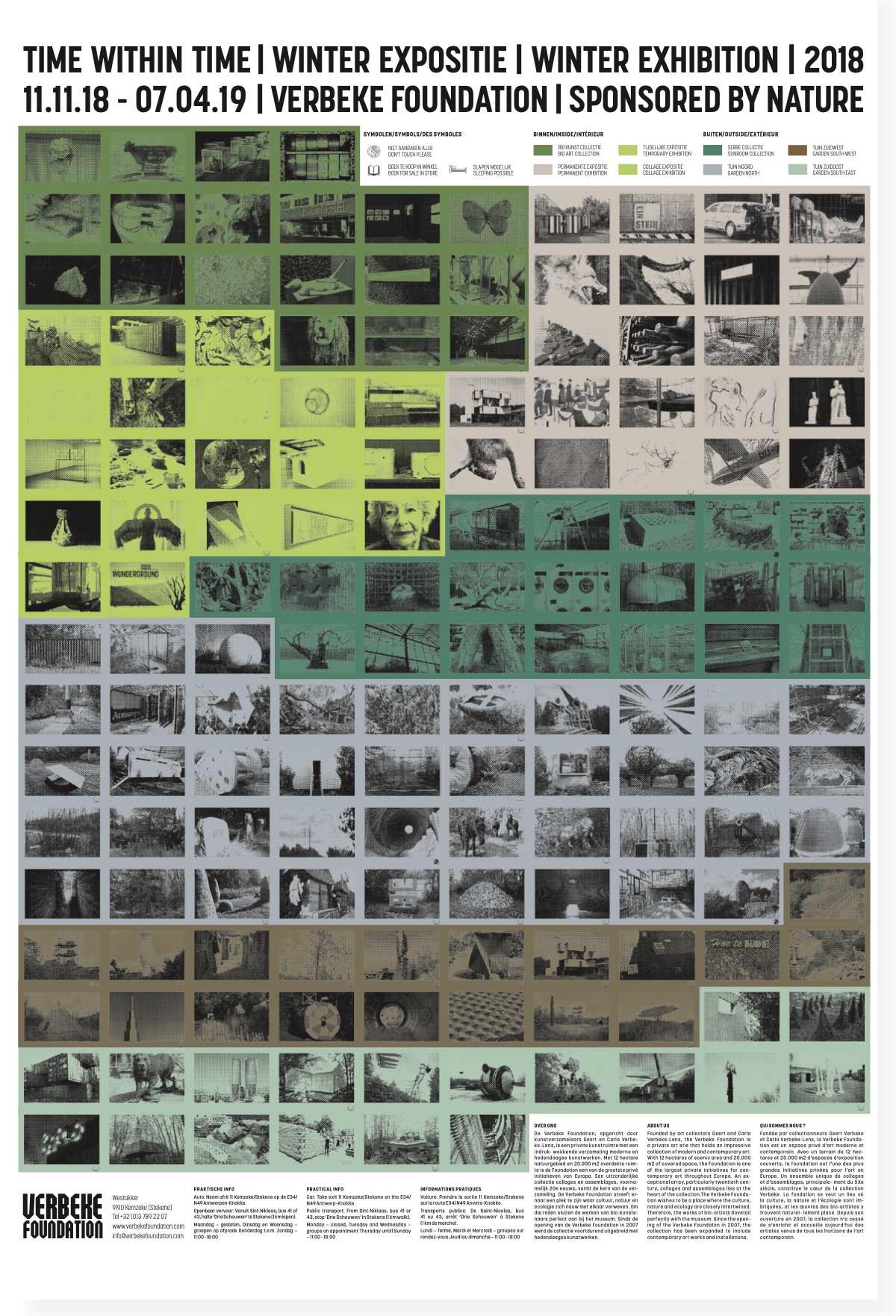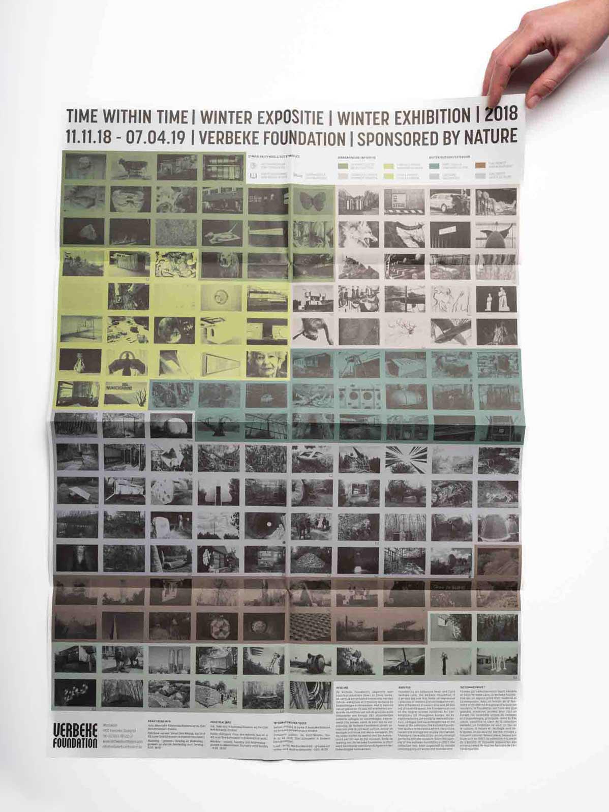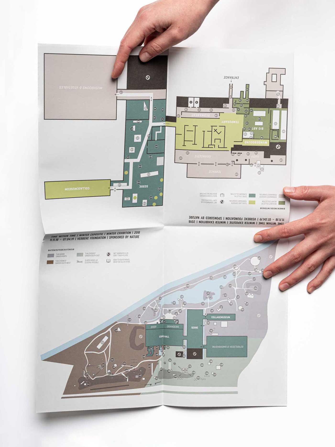 Verbeke wants to allow decay, imperfection, and death into its collection. It wants to collaborate with nature. During this unique period, I designed a new floor plan, which was used for the exhibition Time within Time. I developed a color system where each part of the museum was assigned its own color, corresponding to the colors on the map. When unfolded, the floor plan also served as a large overview poster of the entire collection.