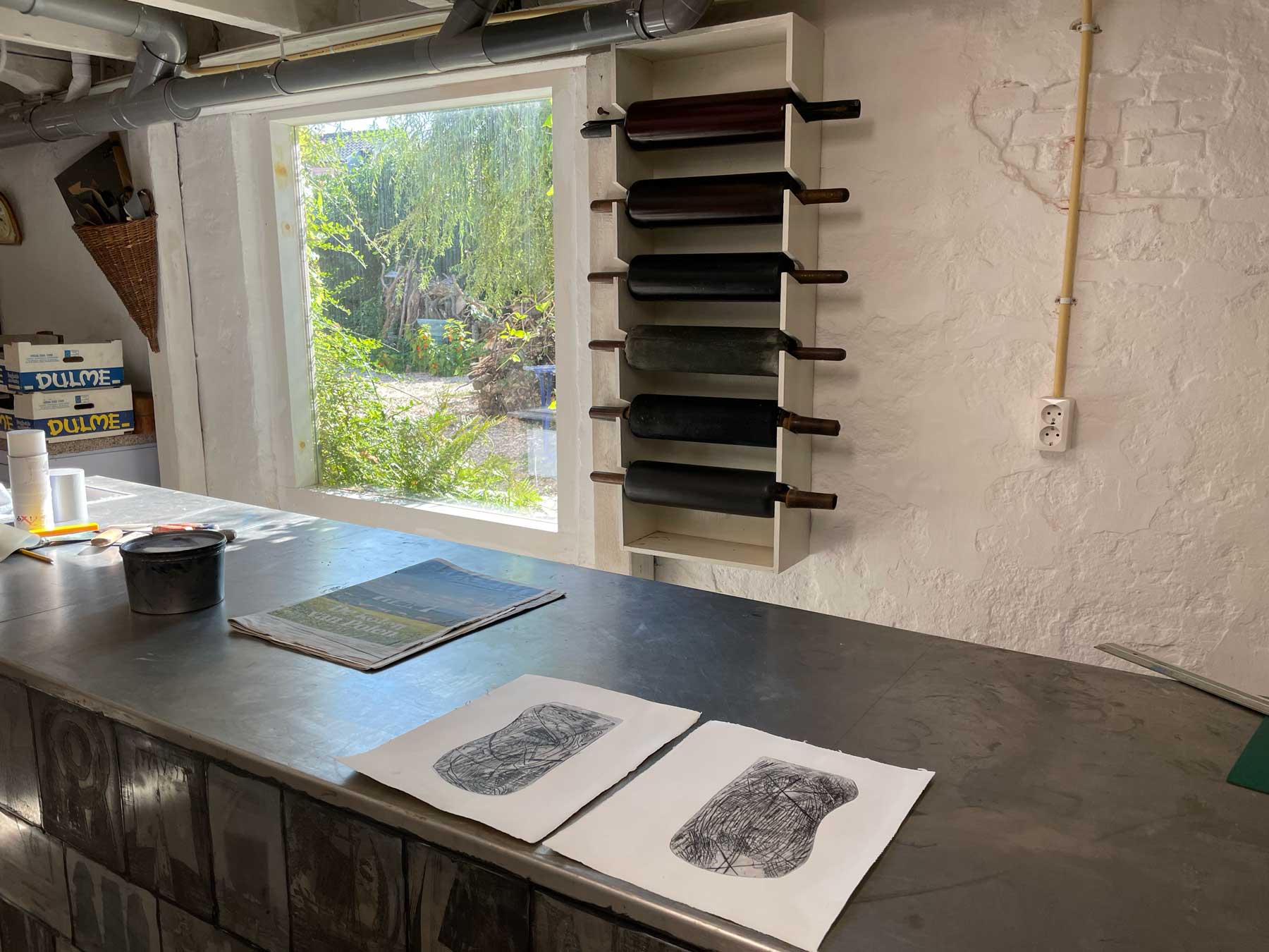 In the past years I have hosted mono-print workshops in the graphic workshop of De Rode Schuur. De Rode Schuur is an Arts & Crafts establishment I co-founded in my parental home in Noordwijk.