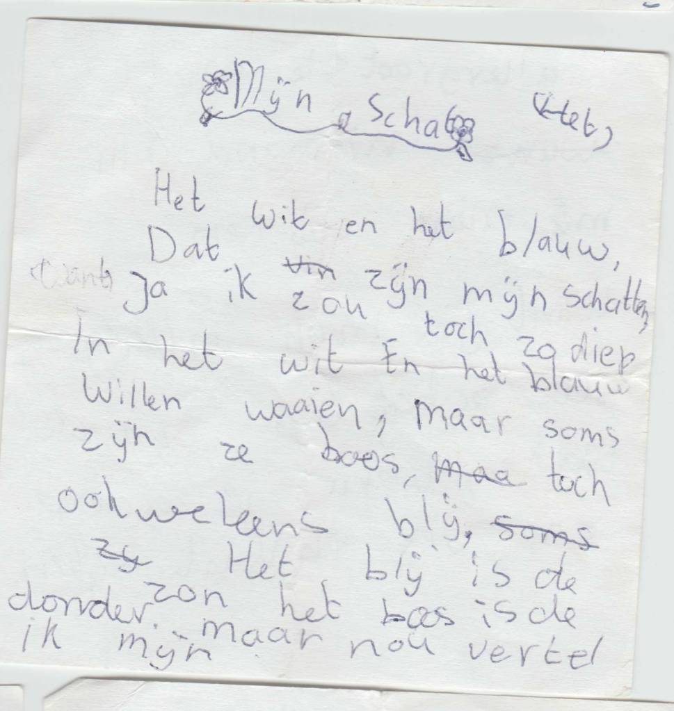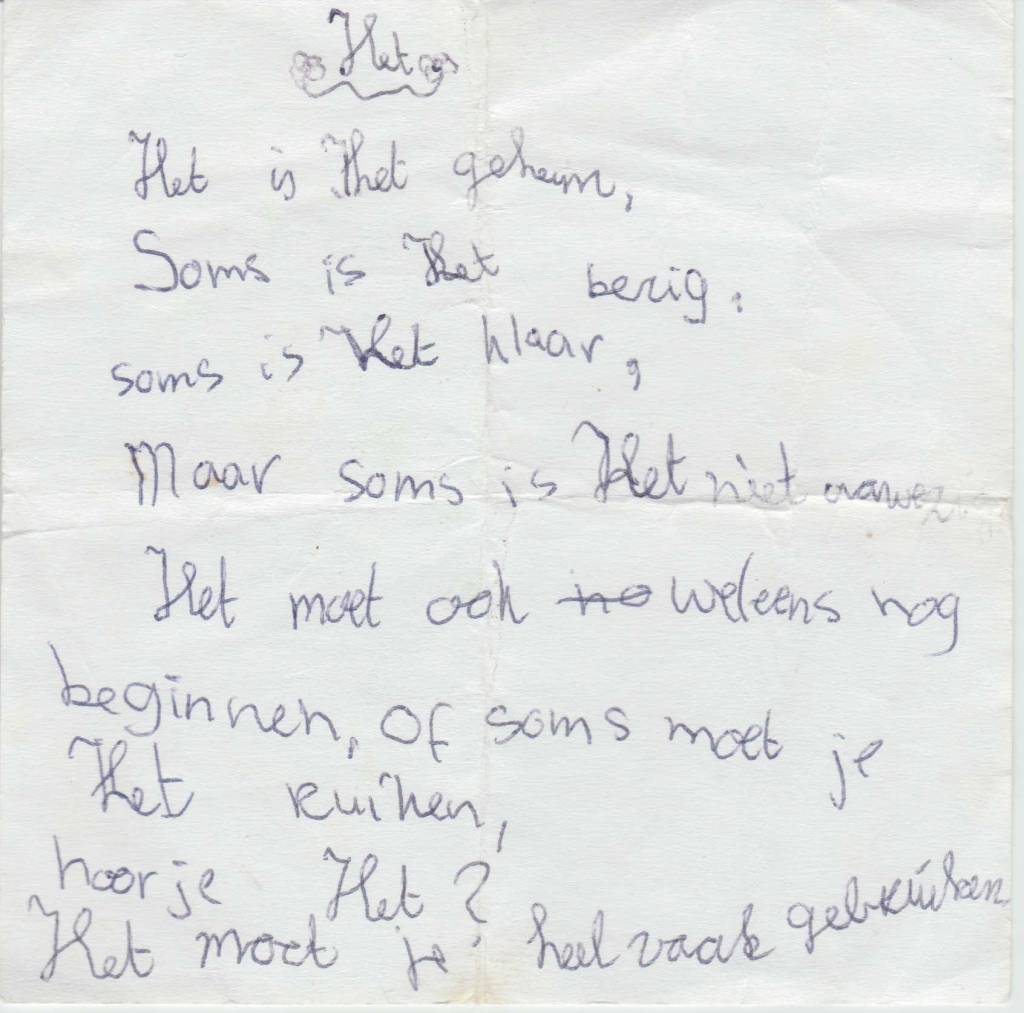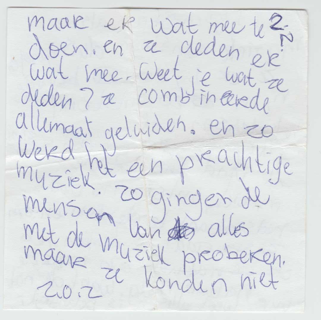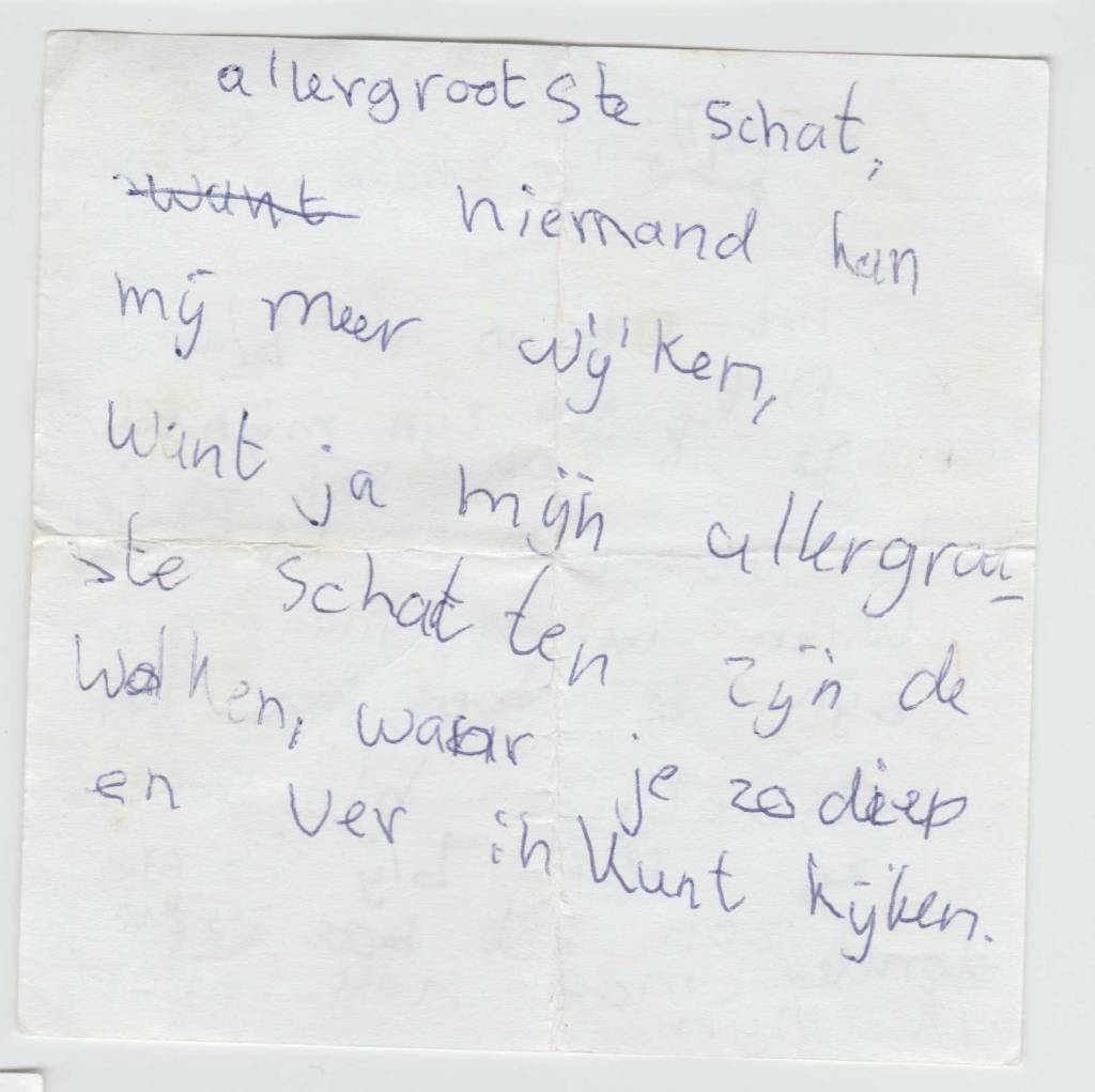 Een selectie van deze gedichtjes kun je hier onder vinden. Zelf vind ik het aandoenlijk en fascinerend om te zien dat ik toen al met alle vormen van creativiteit bezig was. Bijvoorbeeld mijn 4-delige essay over muziek! Geweldig, wie had gedacht dat ik nu zelf muziek zou maken.