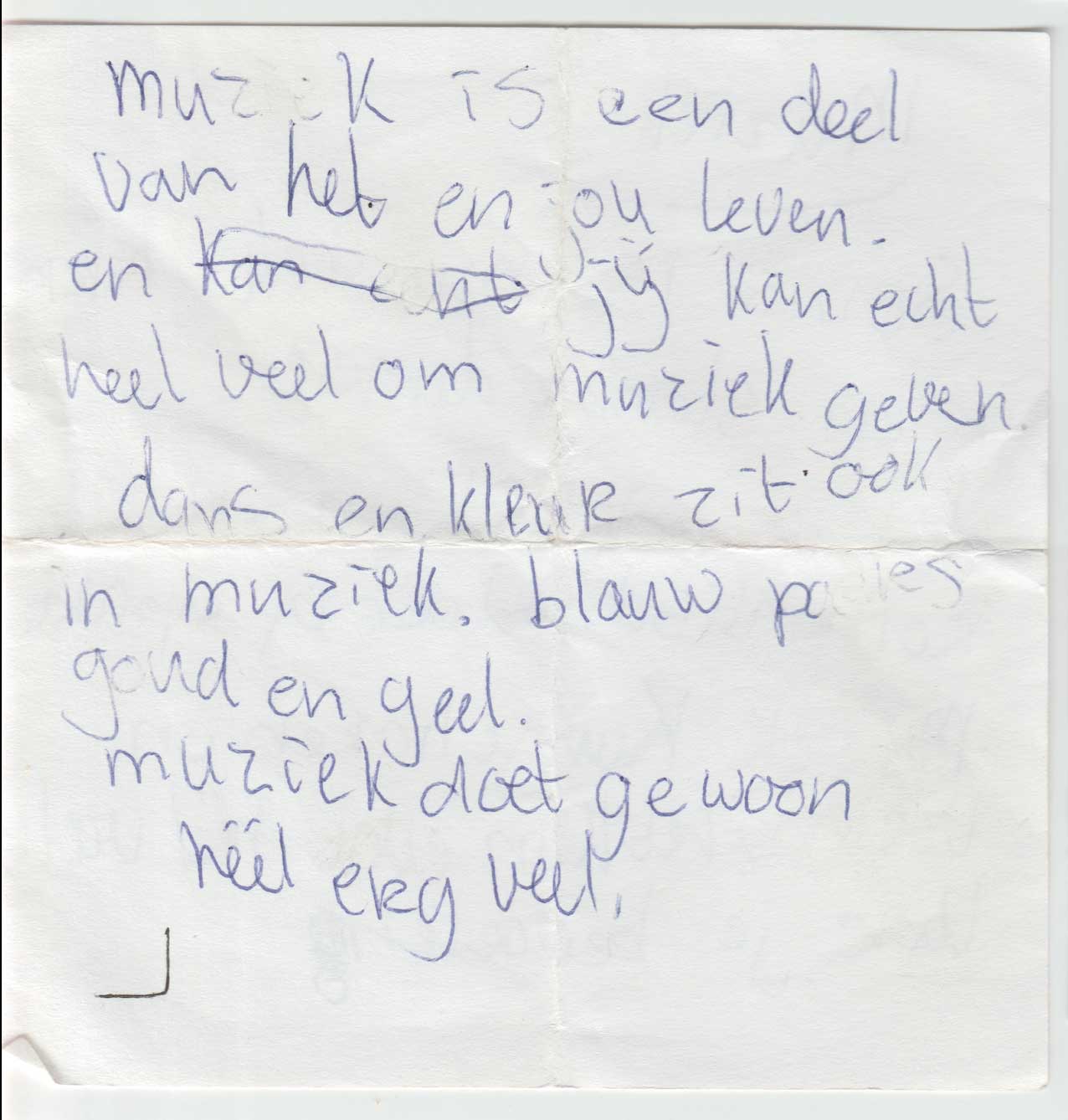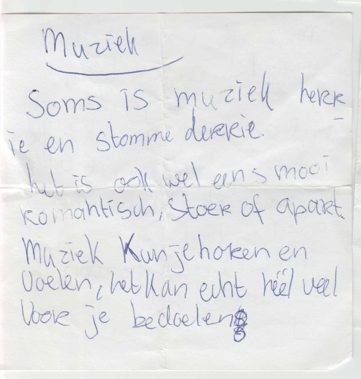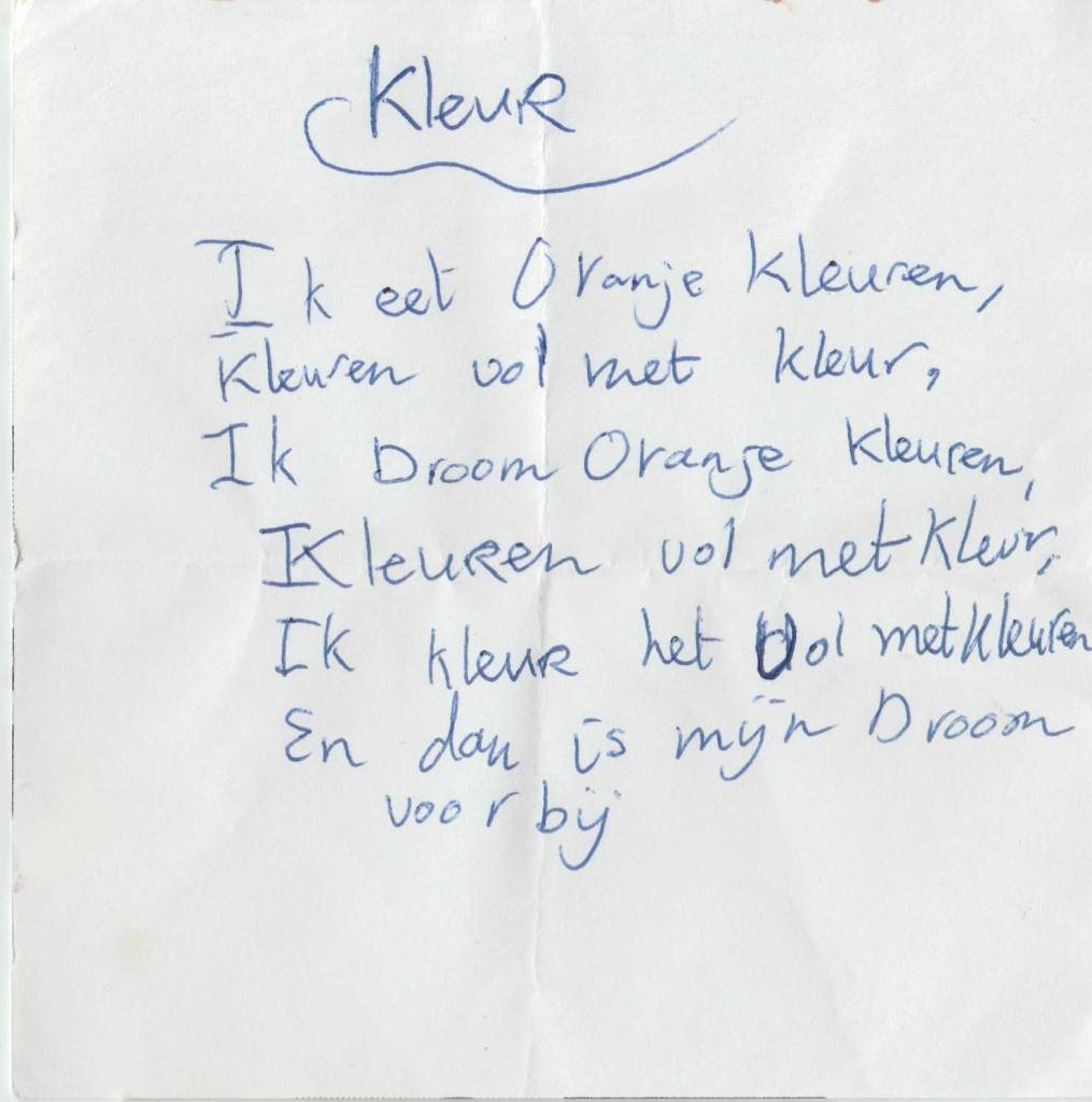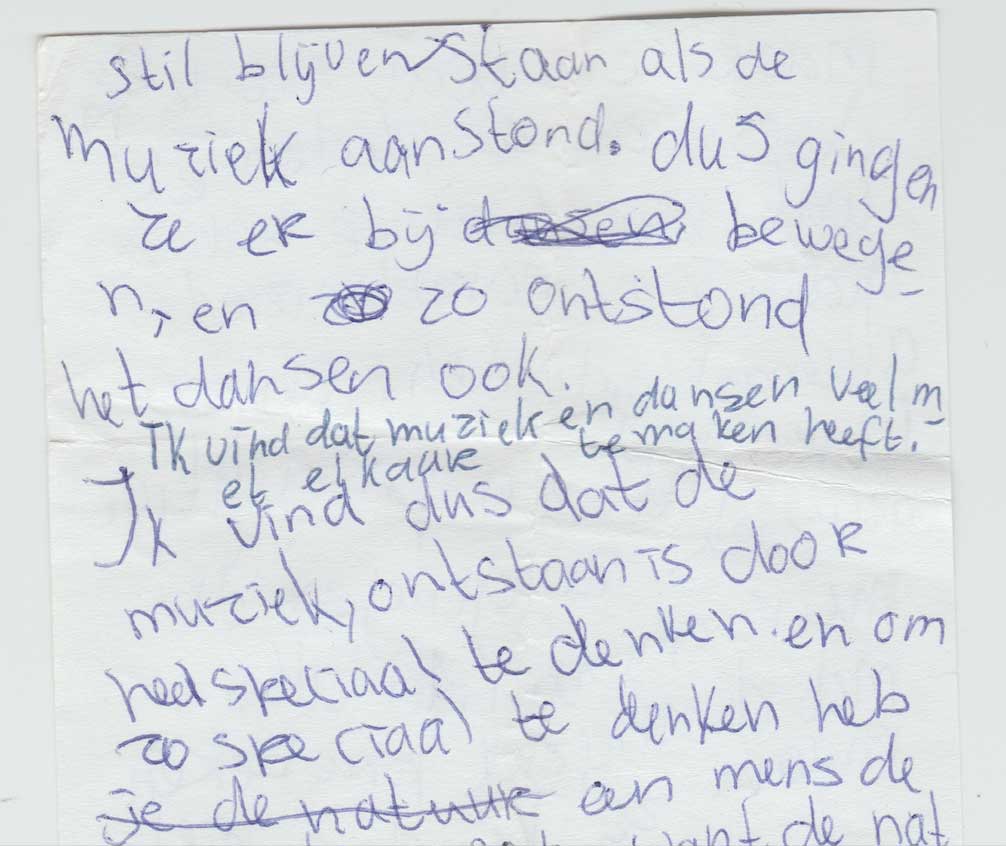 Een selectie van deze gedichtjes kun je hier onder vinden. Zelf vind ik het aandoenlijk en fascinerend om te zien dat ik toen al met alle vormen van creativiteit bezig was. Bijvoorbeeld mijn 4-delige essay over muziek! Geweldig, wie had gedacht dat ik nu zelf muziek zou maken.