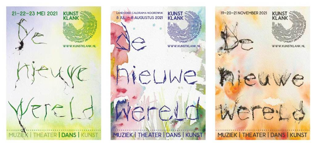 Begin 2021 heb ik de visuele identiteit verzorgd voor het project “De Nieuwe Wereld” van stichting KunstKlank. Het is een serie van drie beelden geworden, die staan voor de drie seizoenen waarin het project speelt. De lettervormen heb ik met de hand gelegd met organische materialen; graswortels, conifeertakjes, en verdorde herfstbladeren. De kringloop van groei, bloei en verval komt hierin terug. Voor mij als graficus, is het heel spannend om juist met de letter het verhaal te vertellen. Terwijl ik met de hand de letters samenstelde, ontstonden er onder mijn handen allerlei vormen. Dit geeft toch een heel ander resultaat dan meteen achter mijn computer te duiken om iets te ontwerpen. Mijn vader heeft in zijn jaren als kunstenaar een geweldig gevoel voor pigmenten en kleuren opgebouwd. Zo heeft hij de kleuren en sferen van de seizoenen in aquarelverf vertaald.